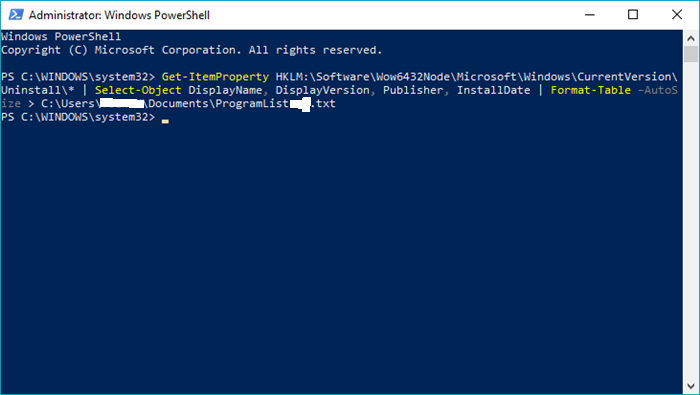 Get-ItemProperty HKLM:\Software\Wow6432Node\Microsoft\Windows\CurrentVersion\Uninstall\* | Select-Object DisplayName, DisplayVersion, Publisher, InstallDate | Format-Table –AutoSize > C:\Users\IMEPOTREBITEL\Documents\ProgramList.txt