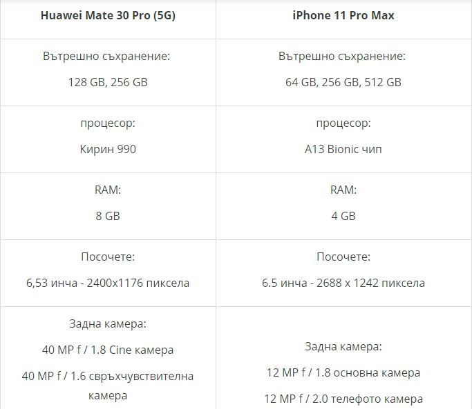 Huawei представи новия си водещ модел смартфон – Mate 30 Pro. iPhone 11 Pro Max или Huawei Mate 30 Pro ? Сравняваме всички технически спецификации на Huawei Mate 30 Pro и iPhone 11 Pro Max.