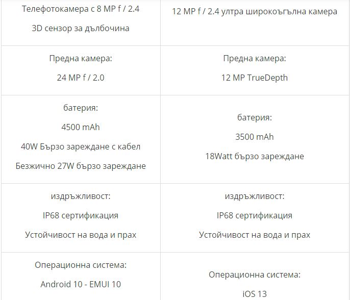 Huawei Mate 30 Pro преодолява iPhone 11 Pro Max с четири сензора на задната камера. Mate 30 Pro има батерия от 4500 mAh, а iPhone 11 Pro Max има батерия от 3 500 mAh. Капацитетът на батерията на iPhone 11 Pro Max е много нисък в сравнение с Mate 30 Pro.