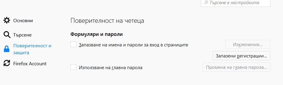 2. След като отворите раздела „Поверителност и сигурност“ вляво, премахваме отметката до „Запомни потребителско име и парола за сайтове“ в менюто „Формуляри и пароли“.