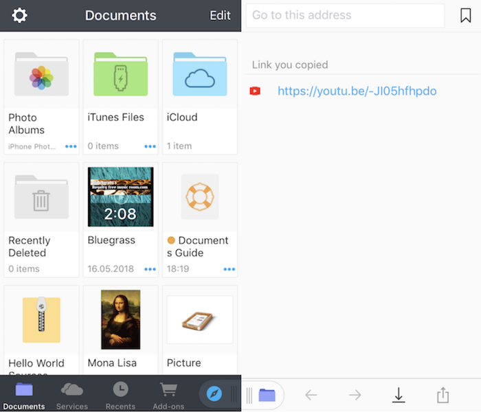 Можете да използвате приложението Documents by Readdle, което се явява в топ 25 в App Store в категорията продуктивност, като избора на Apple редактори, файлов мениджър и медиен плейър, за да изтеглите видеоклипове в YouTube. Само с няколко прости стъпки можете да изтегляте видеоклипове от YouTube в своя iPhone, да ги запазвате във вашия филмов плеър и да ги гледате с любимия си мултимедиен плейър.