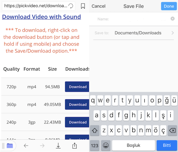 Ако превъртите страницата надолу, ще видите, че Изтегляне на видео със звук е готово за изтегляне на видеоклипове с различно качество и формати. Продължаваме, като докоснем Изтегляне. (Вградения браузър докоснете иконата за изтегляне, за да видите прогреса на изтеглянето.)