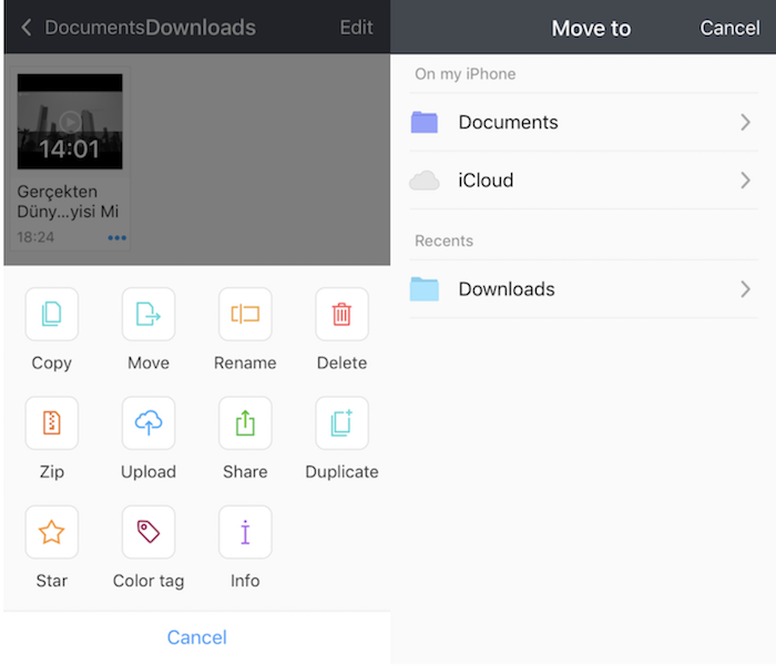 Ако искате да прехвърлите видеоклипа си в ролката на фотоапарата, всичко, което трябва да направите, е много проста: в приложението Documents by Readdle докоснете пурпурната папка и въведете папката Downloads и докоснете трите точки до изтегленото видео, след което докоснете Move.
