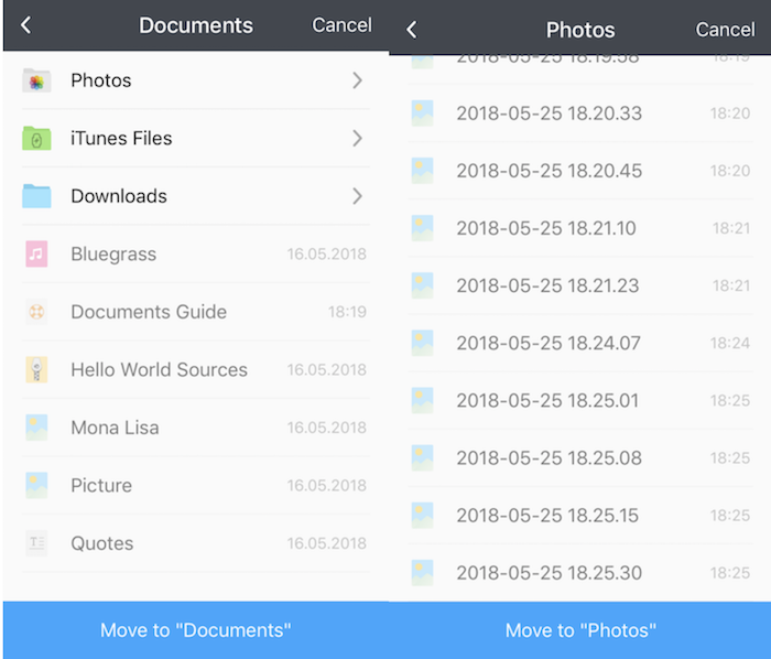 После гледаме пътя Документи – Снимки под На моя iPhone. Когато докоснем „Премести в Снимки“, видеоклипът се премества в лентата с филми.