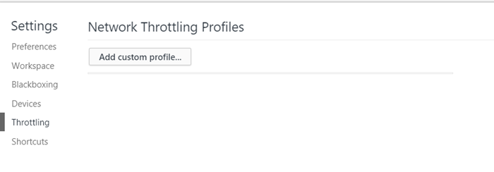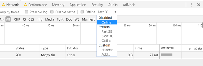 Във втория ред кликнете върху изскачащото меню до опцията „Online – Онлайн“ вдясно. В това меню имате две предварително зададени опции като Fast 3G и Slow 3G. Те може да не работят, защото са предназначени за тестване, така че би било полезно да създадете потребителски профил. За това кликваме върху бутона Добавяне – ADD в менюто за мече.