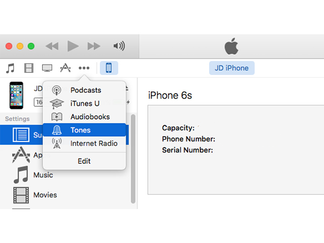 Свържете телефона с компютъра и стартирайте качи, ако не е вече отворен. Изберете трите точки до иконата на телефона и натиснете Тонове от падащото меню. След това преместете новия .m4r файл от компютъра си в прозореца на тонове.