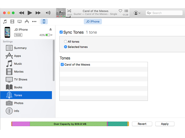 8. Щракнете върху иконата на iPhone и изберете Тонове -> Sync Тонове -> Избрани тонове, изберете тона, и щракнете върху Приложи. Изчакайте процеса да завърши.