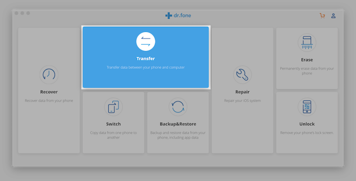 - Казах, че Dr.Fone е функционална програма за прехвърляне на iOS. Секцията „Прехвърляне“, която се грижи за вас от началния екран. Кликвате върху трансфера.