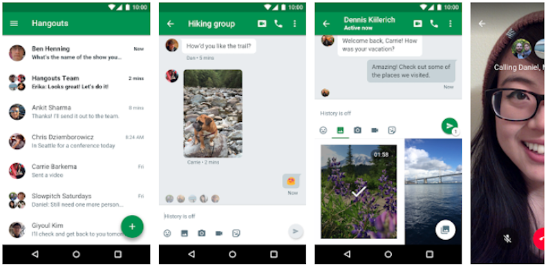 Можете да поддържате връзка в движение, като изтеглите приложението Hangouts за Android / iOS на мобилното си устройство. За да намерите приятелите си, трябва да дадете на приложението достъп до вашите контакти. Когато стартирате приложението, в долния десен ъгъл на екрана ще видите големия зелен + бутон. Можете да изберете да започнете нова сесия за чат или видеообаждане, като го докоснете. Можете да преглеждате историята на разговорите с икони в горната част на екрана, които ви позволяват да започнете видео или телефонен чат, като докоснете едно от имената на вашите контакти. Няма допълнителни опции като споделяне на екрана при видео разговори.