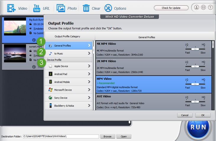 Blu-ray видеоклипове, 1080p многопътни и 4K UHD видеоклипове HEVC, H.264, MPEG-4, MKV, MOD, MP4, AVI, MPEG, MOV, FLV, RMVB, WebM, дронове и видеокамери 4X UHD Video Converter WinX HD Video Converter Deluxe предлага над 420 предварително зададени профила за конвертиране на SD, HD и UHD видеоклипове във формати, които могат да се гледат на различни устройства, включително вашия смартфон / таблет и настолен компютър. потребителски интерфейс, който може да се използва удобно.
