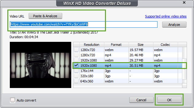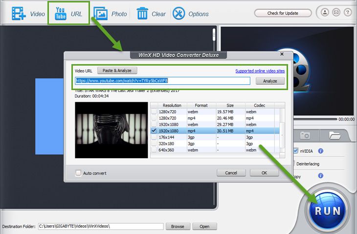 Предлагат се различни опции за разделителна способност и формат. Продължавате, като щракнете върху OK, но тук имаме какво да споменем. Ако искате да изтеглите YouTube видео в MP3 формат, не забравяйте да поставите отметка в „Автоматично преобразуване в долния ляв ъгъл. Накрая щракнете върху бутона RUN, за да започнете процеса на изтегляне на видео.