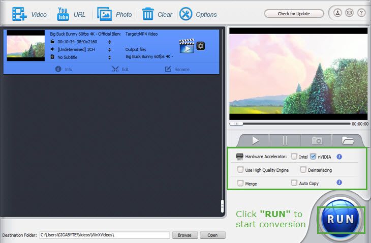 След като изберете формата или устройството, кликнете върху RUN в долния десен ъгъл, за да започнете преобразуването. Предлагат се и опции и опции, които позволяват на компютъра автоматично да се изключи, когато процесът на преобразуване приключи, и да отворите папката, съдържаща конвертираното видео.