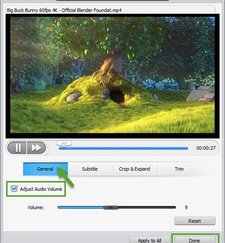 Под Общи настройвате силата на звука на видеоклипа. (Можете да регулирате силата на звука на видеоклиповете или отделно или да спестите време, като приложите промяната към всички видеоклипове с видео. Приложи към всички).