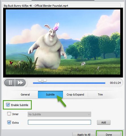 Можете да добавяте субтитри към видеоклипа си под Subtitle. Когато е избран Enable Subtitle, можете да добавите файл със субтитри във формат SRT към видеоклипа, като щракнете върху бутона Extra – Add.