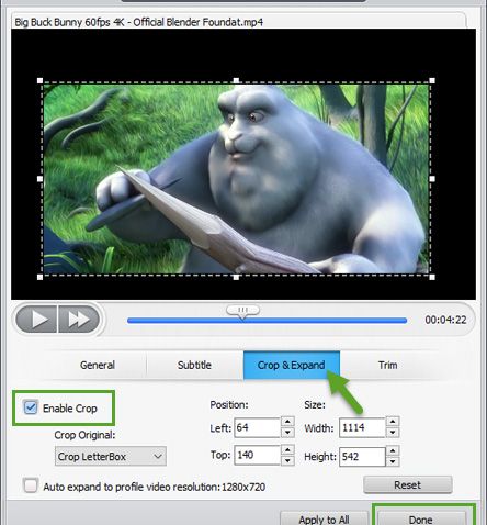 Под Crop & Expand можете да коригирате видеоклипа си в различни съотношения на екрана. Има 5 варианта: безплатно, киноскоп, 16: 9, 4: 3 и 1: 1. Тук задавате разделителната способност на видеото от лявото и горното черно пространство.