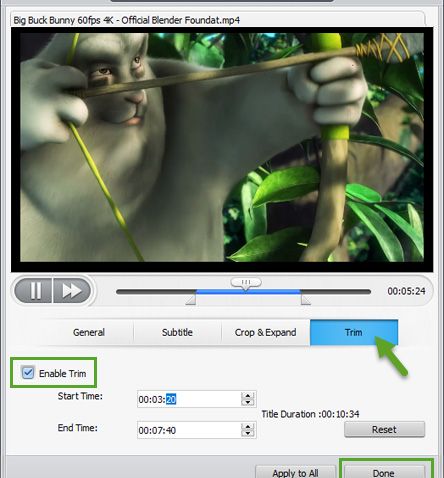 И накрая, под Trim, подрязвате нежелани части от видеоклипа, задавате началната и крайната точка и задавате продължителността.