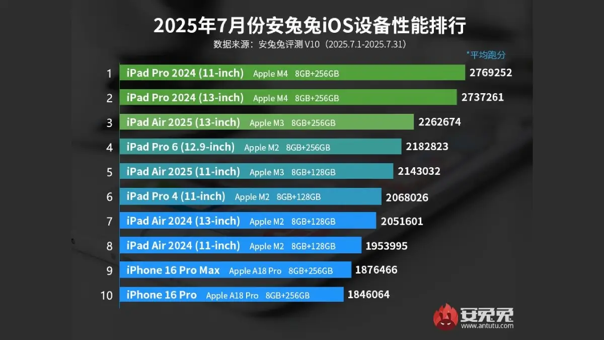 M серийни процесори в iPad Pro моделите осигуряват много по-висока производителност в сравнение с A серийните процесори, използвани в iPhone. Поради тази причина, iPad моделите изпреварват iPhone в класацията на AnTuTu.