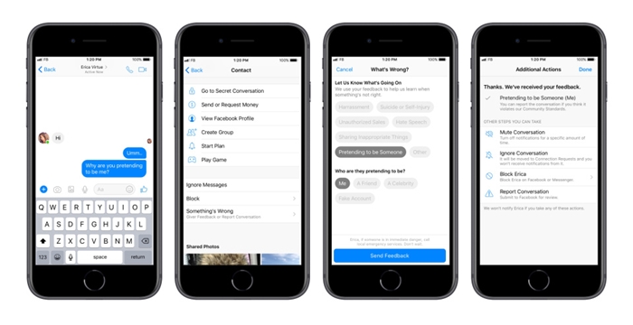 С помощта на бутон, добавен към Messenger, потребителите могат да докладват на екипа за модериране на Facebook в различни категории като тормоз на съобщения за разговори, говорене на омраза и самоубийство. Екипът, който обслужва 50 различни езика, прилага различни санкции срещу потребители, които изпращат непоискани съобщения след преглед на жалбите.