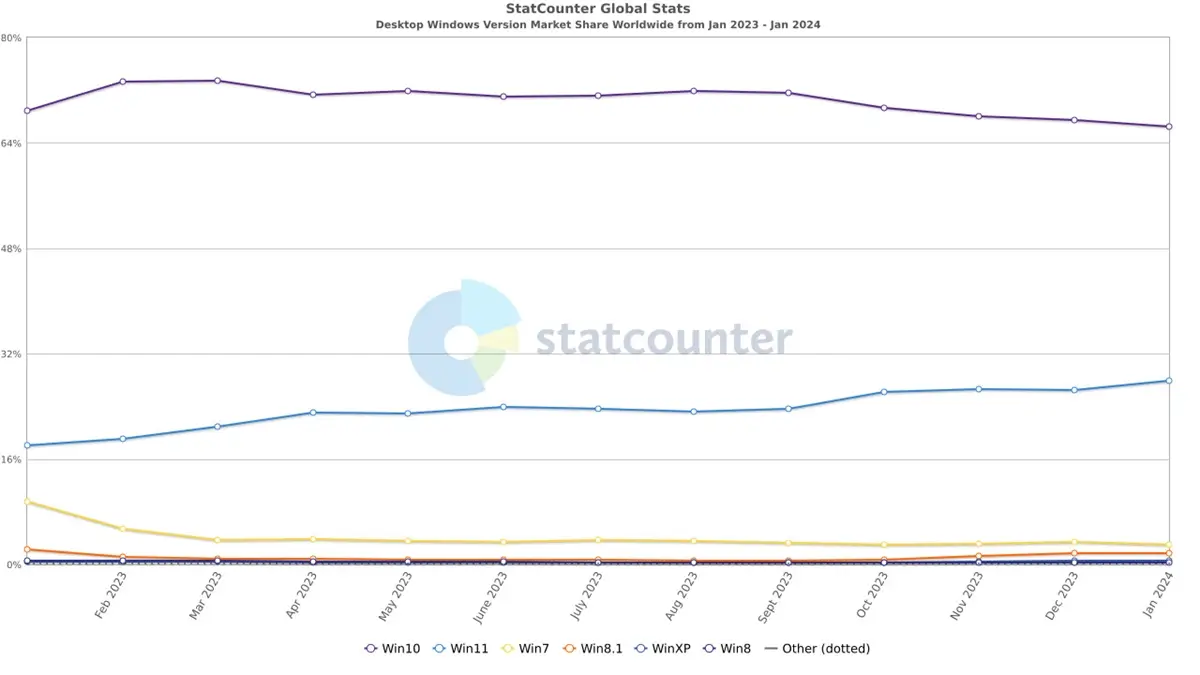 Дори години след пускането на Windows 11, Windows 10 все още е най-популярната операционна система на пазара и има пазарен дял от 66,47% в отчета от януари 2024 г., с -0,95% загуба в сравнение с миналата година.