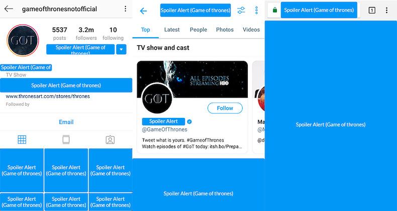 Разбира се; Играта на престолите спойлери не са единственото място, където ще се намира социалните медии. Дори ако не пишете Game of Thrones директно в Google, можете да видите много видеоклипове и снимки. Spoiler Protection , UnSpoiler браузър добавки, мобилни приложения като Spoilers Blocker в мрежата и мобилна игра на спойлери на Thrones могат да бъдат блокирани .